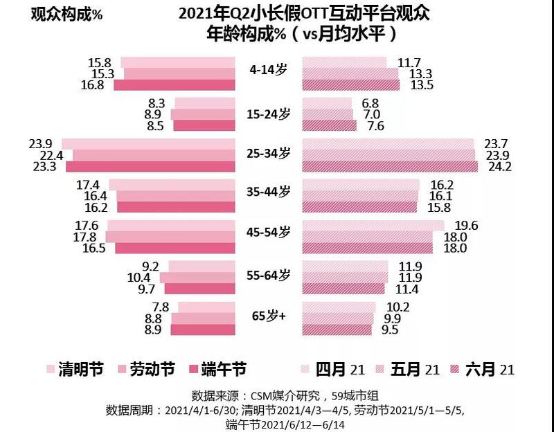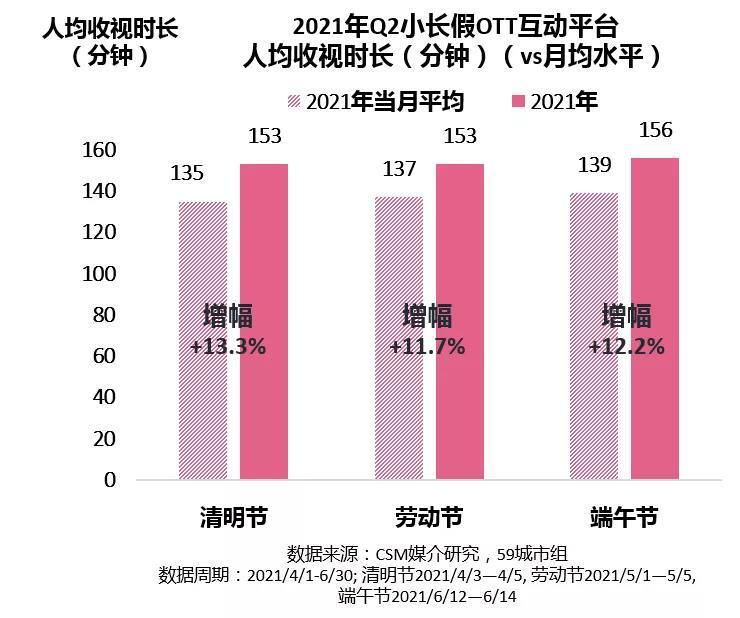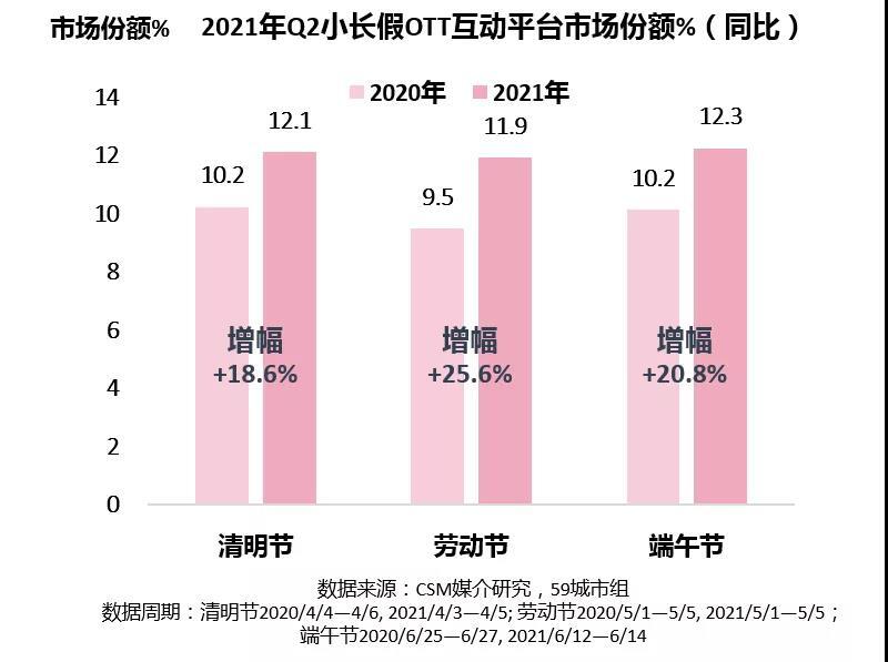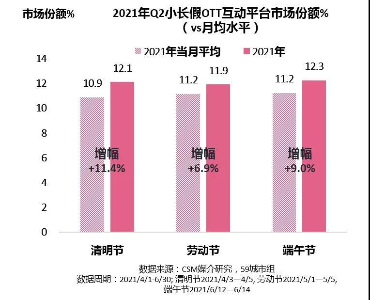 2021年第二季度小长假期间,CSM 59城电视大屏收视市场中约有12%来自OTT互动平台,较去年同期增幅亮眼。在疫情趋于稳定的节假日里,OTT互动平台收视竞争力进一步提升。横向对比小长假之间,收视份额增势相似。