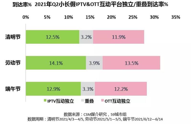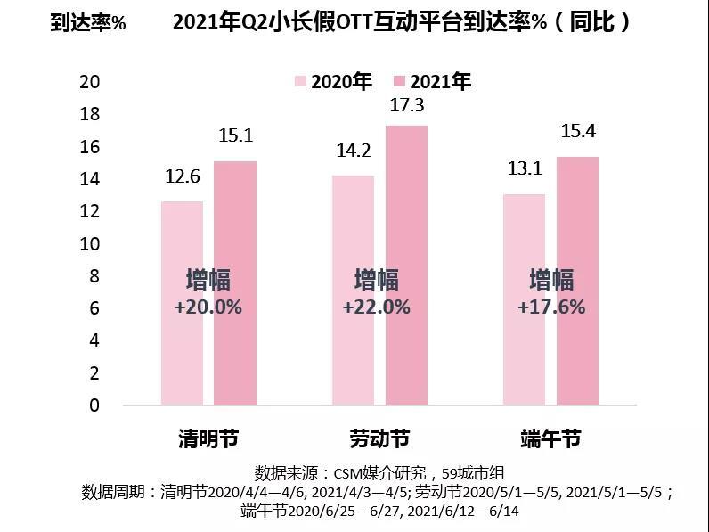 到达率方面,今年第二季度的小长假期间,OTT互动平台显著提升,观众规模同比增幅在20%左右。横向对比小长假之间,到达率提升趋势一致。