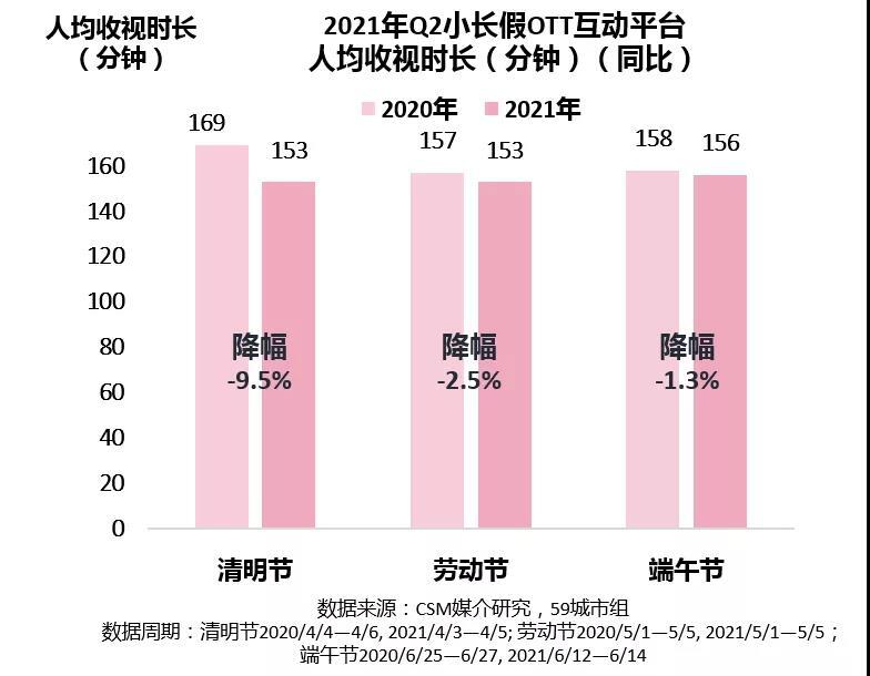 然而,与平台竞争力和观众规模均呈现强势提升不同,今年二季度小长假期间观众的收视粘性稳中微降。与去年同期相比,OTT互动平台观众的人均收视分钟数略有减少。横向对比小长假之间,从清明节到端午节降幅逐渐收窄。