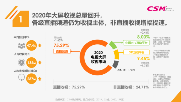 不可否认,各级电视直播频道依然是目前的收视主体,但其在整体收视中的占比却在下降。比如2020年,直播频道收视份额同比上一年下降1.63%;相应的,点播、回看等非直播收视的增幅则在提速,比如直辖市、省会城市每观众日均非直播收视时长已超2小时。