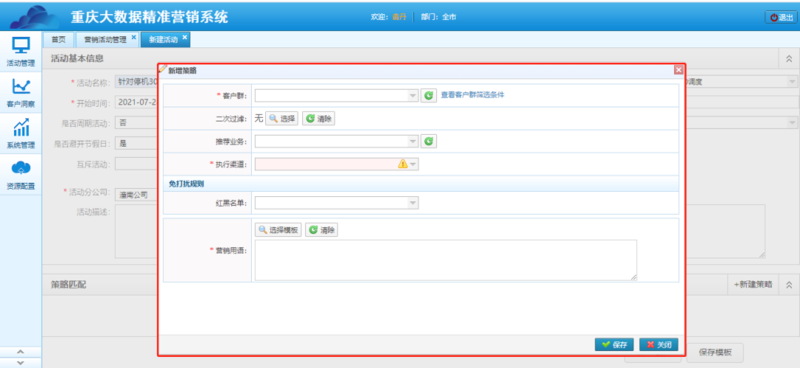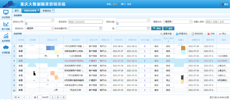 大数据精准营销平台与重庆公司原有的经营分析系统、单兵营维系统、消息平台等系统进行了跨域对接,通过近10次的系统迭代优化,形成了“目标客户数据获取—营销活动策划—营销活动执行—营销活动监控”的系统全流程闭环,便于各分公司在营销活动执行中能够更为直观地获得系统数据辅助,更精准地开展营销工作,更准确地获得结果监管,有效提升了营销成功率。