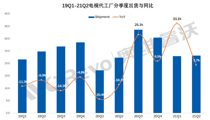 上半年面板供应持续紧张,半导体缺货,给代工企业带来巨大挑战,行业阵营在上半年开始分化。头部代工企业有比较强大的资源整合优势,如集团内资源支持(富士康集团等)、丰富的面板资源和规模优势(TPV)、灵活的面板采购策略(MTC、KTC等),在上半年出货规模实现增长。对中小代工厂而言,面板涨价、资源持续短缺都给代工厂订单的稳定性和持续性带来压力,上半年出货量有不同程度的下滑。