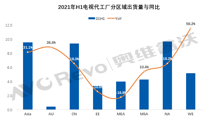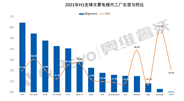 2021年上半年,电视代工市场旺盛的需求延续,奥维睿沃(AVC Revo)《全球TV代工厂月度出货数据报告》显示,2021年上半年全球主要电视代工厂共出货45.9M,同比增长16.5%。一方面是去年受疫情影响,同期基数比较低。另一方面,北美与欧洲等发达经济体在货币和财政政策刺激下,电视需求尚在,欧洲杯、美洲杯以及奥运会的顺利举办也带动市场的持续增长。