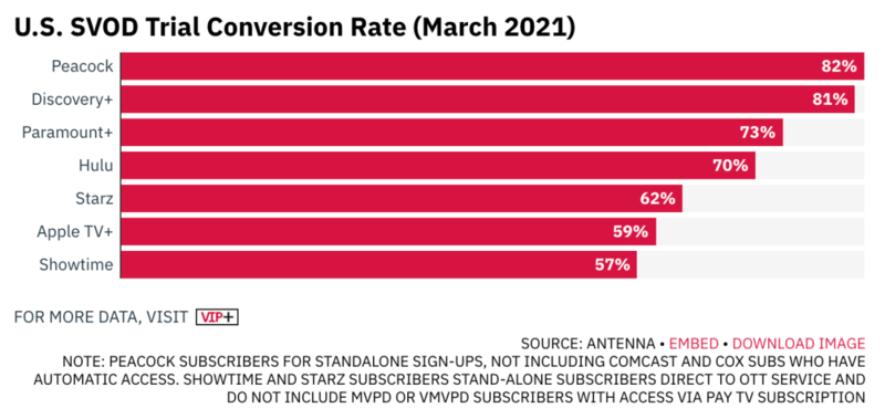 2021年3月提供免费试用期的流媒体平台用户转换率数据。图片来源:Antenna