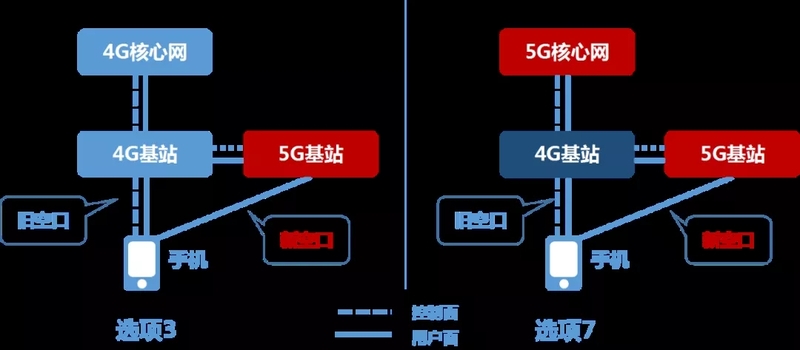 下图是一张非独立组网选项3和选项7的架构图。其中,4G基站和5G基站都连接到了同一套核心网,共同组成了5G非独立组网体系。