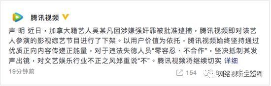 8月17日晚间,腾讯视频官方微博发布声明称,近日,加拿大籍艺人吴某凡因涉嫌强奸罪被批准逮捕,腾讯视频即对该艺人参演的影视综艺节目进行了下架。