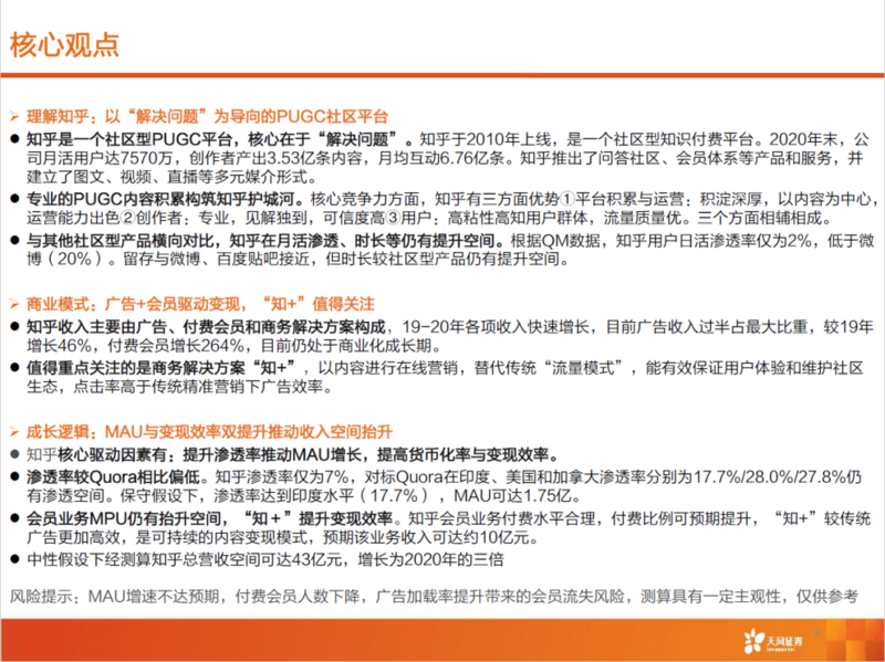 知乎核心驱动因素有:提升渗透率推动MAU增长,提高货币化率与变现效率。