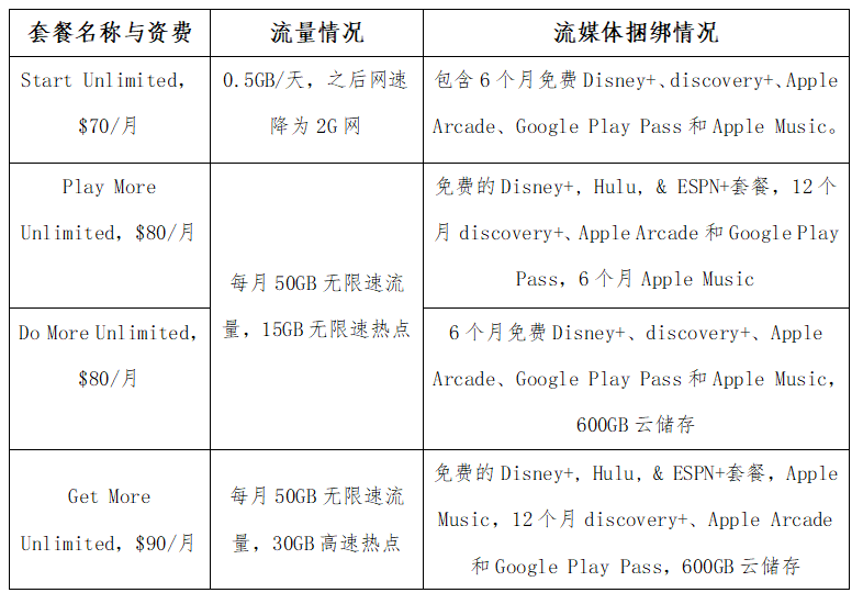 表为、美国5G套餐的流媒体捆绑案例:Verizon