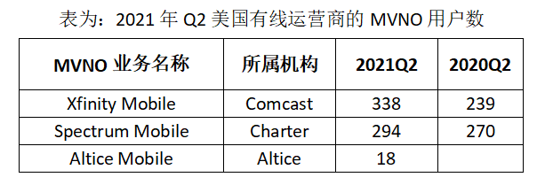 2021年7月,知名调研机构Parks Associates针对2021年Q1的调研数据表明,美国有线电视公司在发展新的捆绑方面取得了一些成功,主要是推出了Wi-Fi优先的移动虚拟运营服务。该机构数据表明:4%的美国宽带家庭表示订阅了有线运营商的移动虚拟运营服务。
