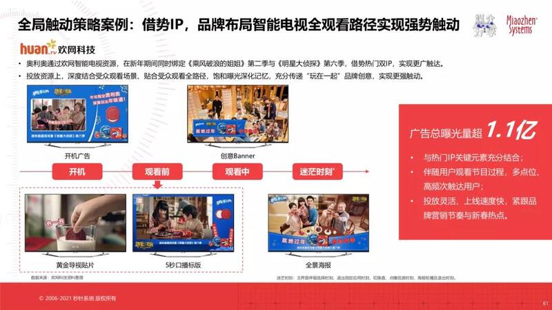 针对品牌节点营销、快速引爆市场的需求,投放智能大屏可短时间、高频次全量覆盖市场。比如针对世界杯、奥运会等大型体育赛事,以及春节、中秋等传统节日,家人围坐在客厅观看电视是家庭中的典型场景;针对双11、618等购物节,更是电商活动全方位抢占用户焦点的重要时机。