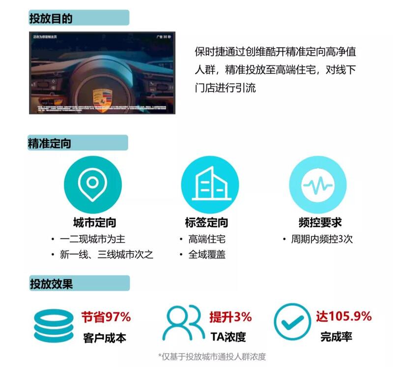 各类智能大屏端的定投策略日益成熟、广泛应用,在创维酷开与保时捷的合作案例中,基于品牌投放策略,精准投放至高端住宅,辐射核心受众,对线下门店进行引流。最终帮助客户节省97%的成本,提升TA浓度3%。