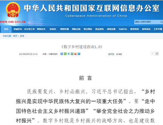 2021年,数字乡村被摆到更为重要的位置。在十四五规划中(2021年-2025年),明确提出要“建设智慧城市和数字乡村”、“以数字化助推城乡发展和治理模式创新”、“加快推进数字乡村建设”,彰显出数字乡村建设在国家现代化新征程中的战略意义和重大价值。在今年2月份,发布的中央一号文件中,也提出全面推进乡村振兴,实施数字乡村建设发展工程。9月,农业农村部、国家发改委、工信部等多部门联合发布《数字乡村建设指南1.0》,为全国推进数字乡村建设绘制出总体“施工图”,提供更具条理性、针对性的指导意见。