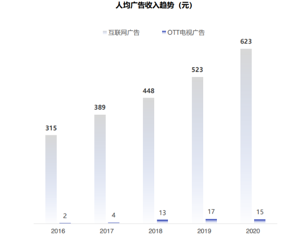 相应的这种差距也体现在人均广告收入方面,《2020年智慧屏行业发展白皮书》显示,OTT大屏人均广告收入仅为15元,而同期互联网广告为623元。