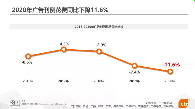 《2020年中国广告市场回顾》报告显示,2020年广告刊例花费在2019年同比下降7.4%的基础上,又下降了11.6%,并首次出现减少预算的广告主比例高于增加预算广告主的情况。