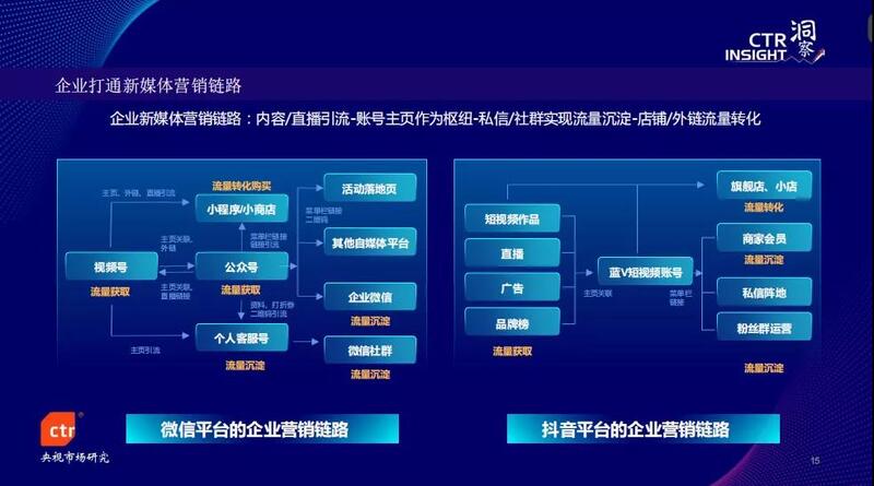 以微信和抖音为例,微信平台的营销链路为:视频号、公众号主要实现流量获取功能;小程序/小商店负责流量转化;而个人客服号、微信社群和企业微信则进行流量沉淀。