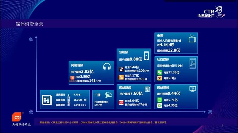 通过受众规模和人均接触时长来分析全媒体的生态,我们发现电视媒体的核心地位依然稳固,观众规模达到12.8亿,15-24岁观众收看时长涨幅达18%,体现了年轻观众的回归。