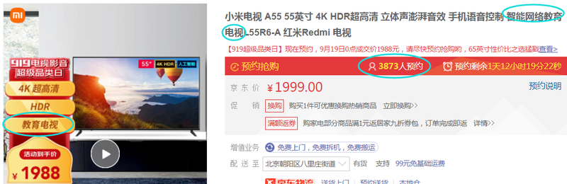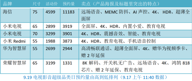 仔细看这前十,其中把教育电视作为突出卖点(在海报及产品标题突出)的是小米,其它九款突出的4K、智能、交互、远场语音、高清通话、智能书写等不同侧面。6款参加“9.19电视影音超级品类日”预售的产品中,在9月17日11:40,预约量最高的过万,最低的1000多。