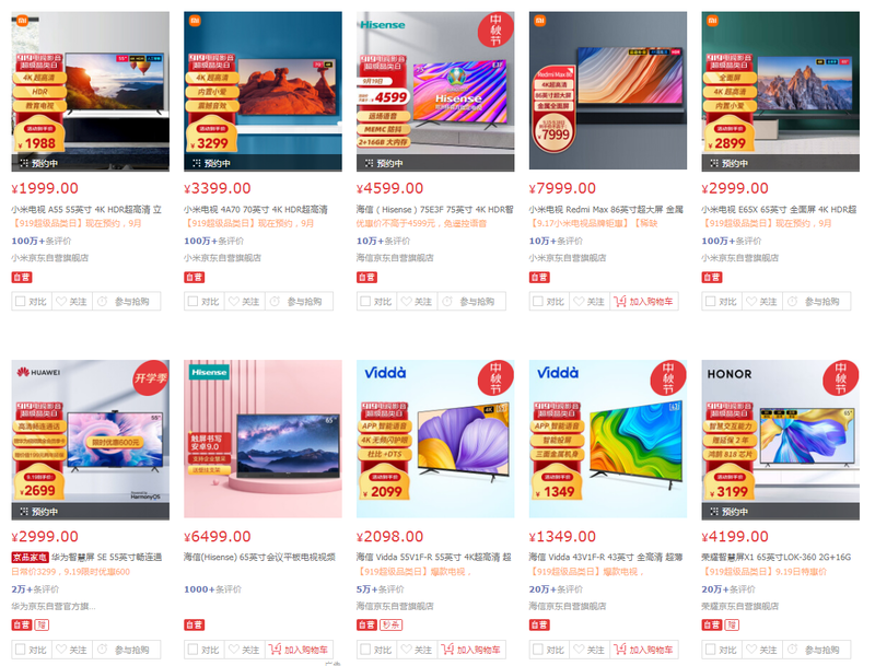 9月17日在京东教育电视品类下,销量前十有四款小米(其中两款是小米旗下红米品牌),四款海信(其中两款是海信旗下VIDAA品牌)、一款华为智慧屏、一款荣耀智慧屏,“9.19电视影音超级品类日”价格从1349到7999元,尺寸除了一款43寸的,其它都是55寸以上,最大最贵的一款是86寸7999元。排在前三位的是小米电视55寸(1999元)、小米电视70寸(3399元)、海信75寸(4599元)。现在手机价格越来越贵的同时,屏幕大上许多的电视价格却一路走低,而且,电视的更新频率也远低于手机。