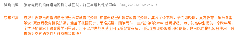 笔者查看产品点评及提问部分,涉及教育的不太多,其中小米教育电视的咨询部分有问教育电视机和普通电视机的区别,回答的比较有针对性。