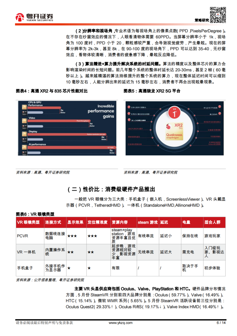 (一)技术:易用,体验感升级。目前VR从光学、清晰度、质量、分辨率等各方面的技术都已经达到了易用的标准。2019年之前VR设备的眩晕问题严重,经过屏幕刷新率、分辨率、算法等技术的改进,目前的VR设备除了小部分敏感人群外,眩晕问题已被解决。