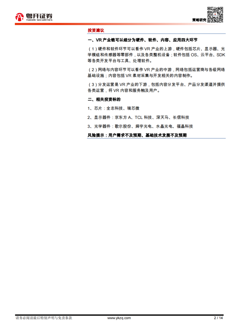 (1)硬件和软件环节可以看作VR产业的上游,硬件包括芯片、显示器、光学模组和传感器等零部件,以及各类整机设备;软件包括OS、云平台、SDK等各类开发平台与工具、处理软件。