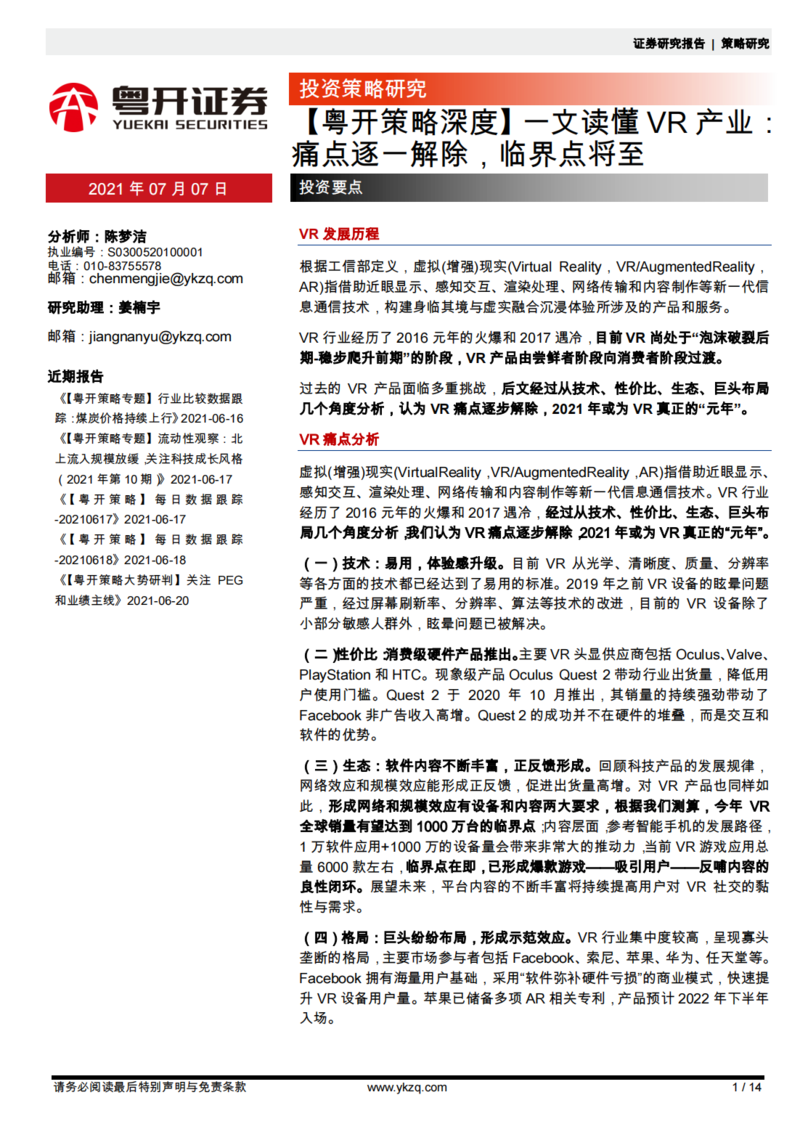 过去的VR产品面临多重挑战,后文经过从技术、性价比、生态、巨头布局几个角度分析,认为VR痛点逐步解除,2021年或为VR真正的“元年”。