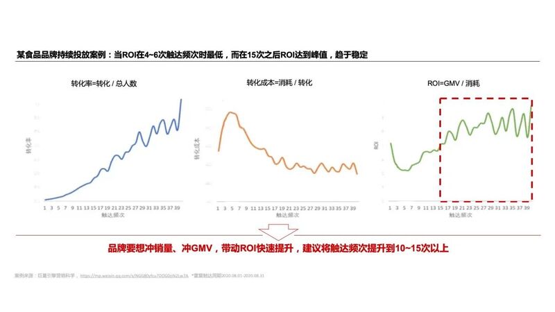 4. 9-15次频次的品效广告投放,ROI的边际效率是上升的。