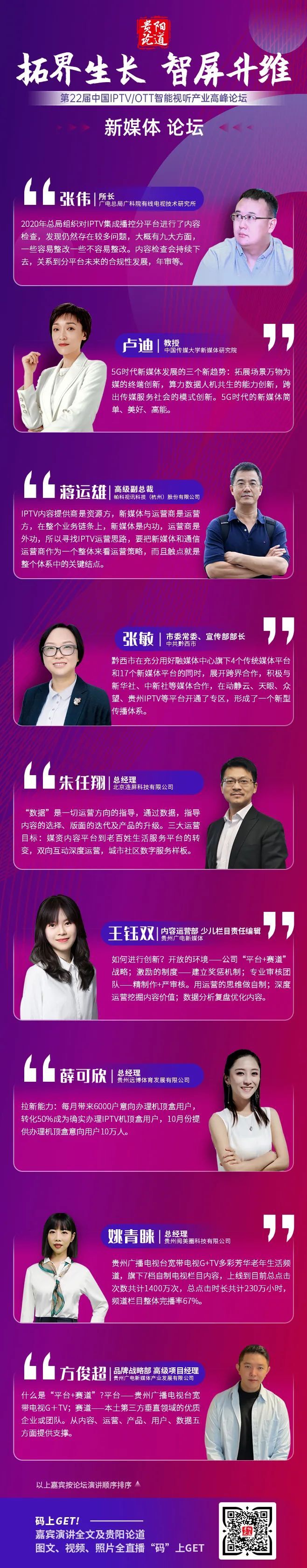 2021年10月20-21日,由贵州广播电视台、中共贵阳市委宣传部指导,流媒体网主办,贵州广电新媒体产业发展有限公司承办,中共贵阳市观山湖区委宣传部、贵州移动、贵州电信、贵州联通协办的第22届论道暨中国IPTV/OTT智能视听产业高峰论坛在贵阳隆重举行。本届论道以“拓界生长 智屏升维”为主题,吸引了来自产业链各方核心人员。