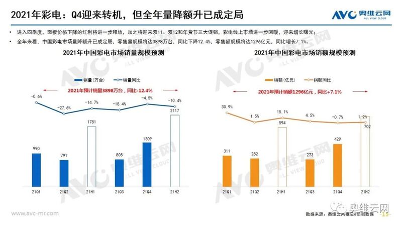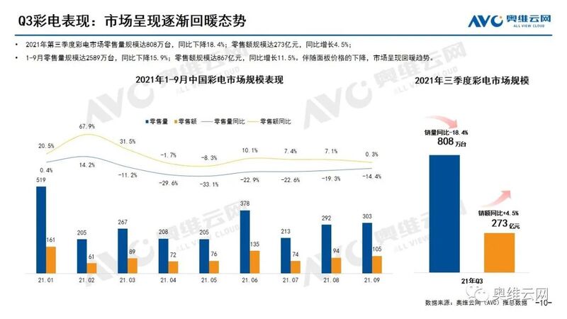 2021年三季度中国国民经济总体保持恢复态势,家电行业发展的外部环境基本面稳定向好。TV面板结束史上最长涨价周期,价格自7月正式进入下降通道。随着面板价格的持续下滑,彩电市场呈现回暖趋势。据奥维云网(AVC)全渠道推总数据显示:2021年三季度彩电市场零售量规模达808万台,同比下降18.4%;零售额规模达273亿元,同比增长4.5%。