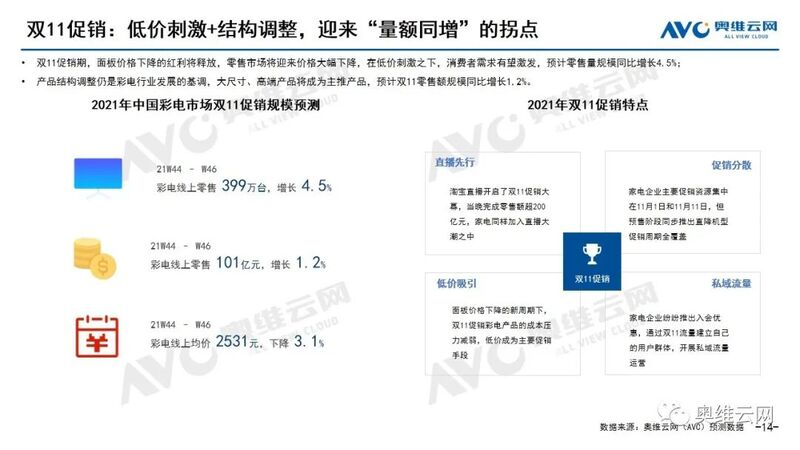 双11促销从“人、货、场”全面发力,借助平台从消费者需求出发以优质产品激发消费潜力。同时面板价格下降红利将在双11促销中释放,彩电企业营销力度加大,低价刺激和结构升级双重作用下,市场有望迎来量额双增。
