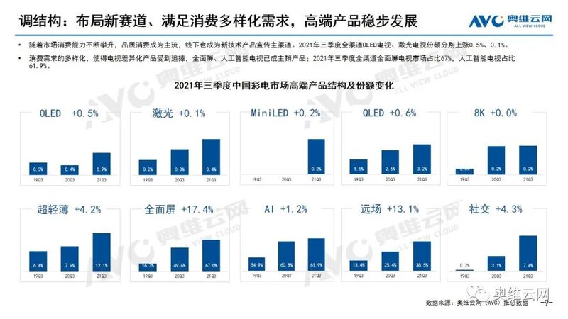 调结构:从产品结构来看,彩电依旧聚焦于“大屏化”市场,三季度55寸和65寸占比接近50%,75寸产品进入成长期,85寸成为80+市场的主流;线下高端产品份额持续走高;全面屏、人工智能电视已成主销产品。