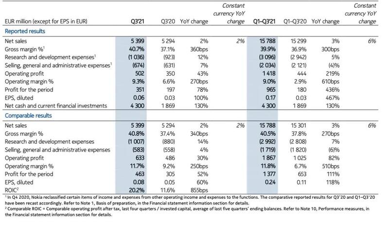 诺基亚10月28日正式公布了2021年第三季度财报信息。财报显示,诺基亚Q3净销售额53.99亿欧元,上年同期为52.94亿欧元,同比增长2%;营业利润为6.33亿欧元,同比增长30%;可比摊薄后每股收益为0.08欧元,上年同期为0.05欧元。