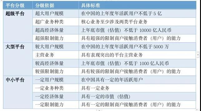 超级平台在中国的上年度年活跃用户不低于5亿、核心业务至少涉及两类平台业务、上年底市值(估值)不低于10000亿元人民币、具有超强的限制商户接触消费者(用户)的能力;大型平台在中国的上年度年活跃用户不低于5000万、具有表现突出的平台主营业务、上年底市值(估值)不低于1000亿元人民币;中小平台则指在中国具有一定的年活跃用户。