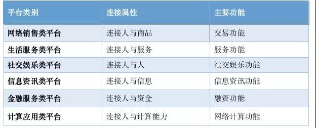 此外,结合我国平台发展现状,依据平台的连接对象和主要功能,将平台分为以下六大类:网络销售类平台、生活服务类平台、社交娱乐类平台、信息资讯类平台、金融服务类平台、计算应用类平台。