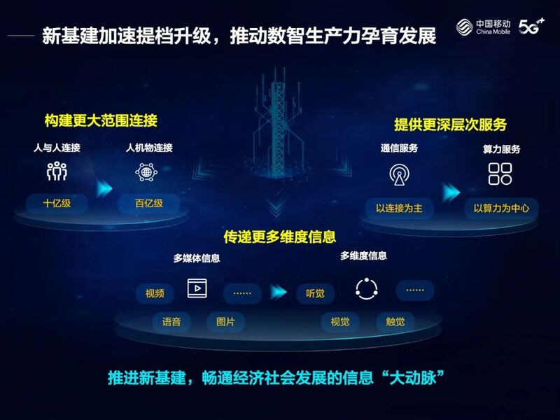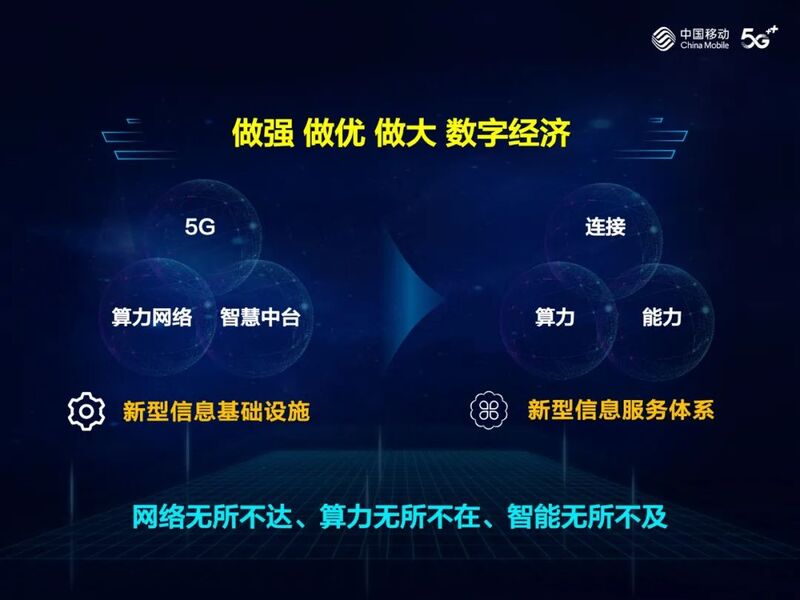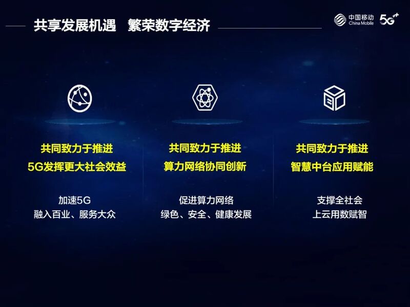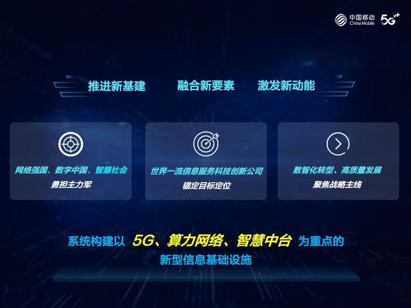 中国移动将勇担网络强国、数字中国、智慧社会主力军,锚定世界一流信息服务科技创新公司目标定位,聚焦“数智化转型、高质量发展”主线,系统构建以5G、算力网络、智慧中台为重点的新型信息基础设施,放大信息通信企业拉动投资、促进消费的“扁担效应”,助力数字经济蓬勃发展。