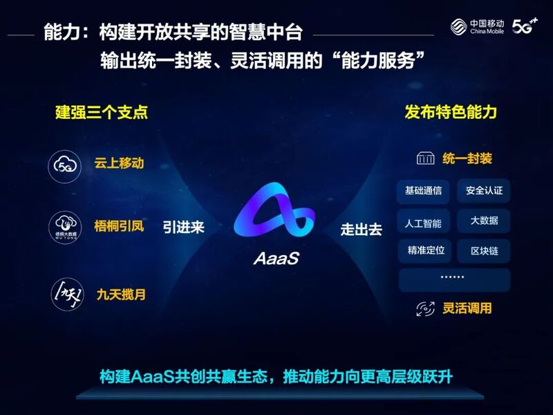 对外拓展全社会数智化应用,支撑社会信息的多维采集、海量分析、实时处理,助力提升生产生活、社会治理数智化水平。利用智慧中台,构建AaaS共创共赢生态,推动能力向更高层级跃升。积极探索“引进来”,建强“云上移动”(移动云)、“梧桐引凤”(梧桐大数据平台)、“九天揽月”(“九天”人工智能平台)三个支点,吸引优质能力入驻。加快推进“走出去”,整合发布基础通信、人工智能、大数据、区块链、安全认证、精准定位等特色能力,输出统一封装、灵活调用的能力服务,实现社会价值、用户价值、企业价值共同提升。