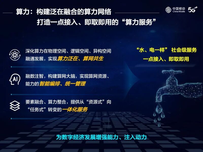 5G、算力网络、智慧中台融合互通、协同共进,一起构成“连接+算力+能力”新型信息服务体系,促进资源、要素的高效汇聚、流动、共享,推动实现网络无所不达、算力无所不在、智能无所不及,支撑数字经济不断做强做优做大。