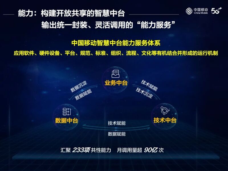 中国移动打造的智慧中台能力服务体系,是应用软件、硬件设备、平台、规范标准、组织、流程、文化等一系列元素有机结合并形成的运行机制。