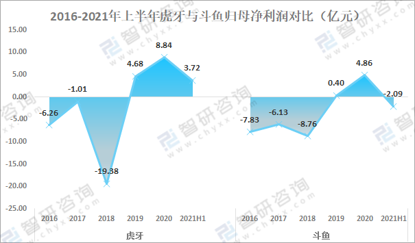2016-2021年上半年虎牙与斗鱼归母净利润对比(亿元)