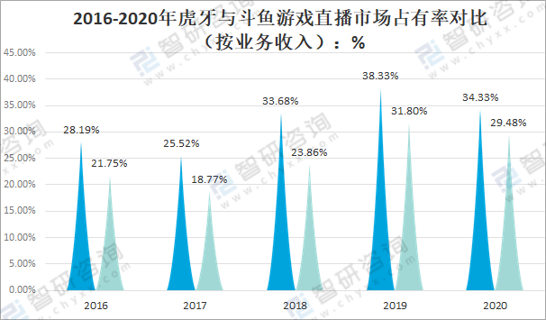 2016-2020年虎牙与斗鱼游戏直播市场占有率对比(按业务收入)