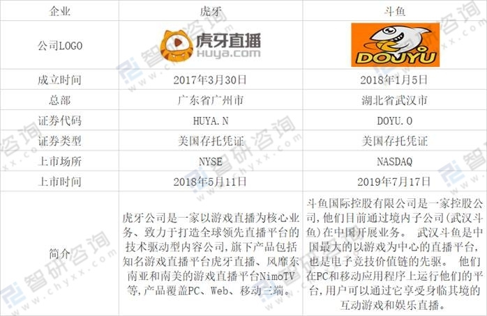 游戏直播行业在朝着多元化的方向发展,多样的游戏直播平台不断崛起,并且依靠自身的特色优势占据市场,从最初的单纯提供视频直播服务,到如今成熟的会员体系、充值模式等,内容和用户体验不断优化,使其受众规模呈爆发式增长。随着中国游戏直播市场的高速发展,涌现一匹如虎牙、斗鱼等最具代表性的优秀企业,从成立和上市时间来看,虎牙成立时间和上市时间均早于斗鱼,虎牙总部在广东省广州市,斗鱼总部在湖北省武汉市。