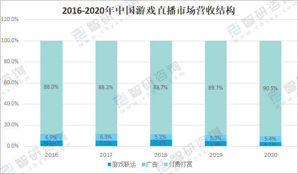 中国游戏直播市场通过付费打赏、广告、游戏联运等方式保持了较强的盈利能力,同时也与游戏开发公司进行了从版权采买到游戏宣发的双向互动,实现了互利共赢。2020年付费打赏业务收入占中国游戏直播市场营业收入的90.5%,较2019年增加了0.8%,是中国游戏直播行业营业收入的主要来源;游戏联运业务收入占中国游戏直播市场营业收入的4.1%,较2019年减少了0.9%;广告业务收入占中国游戏直播市场营业收入的5.4%,较2019年增加了0.1%。