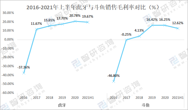 2016-2021年上半年虎牙与斗鱼销售毛利率对比(%)