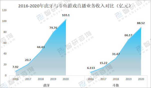 从游戏直播业务收入来看,2020年虎牙和斗鱼游戏直播业务收入增幅明显。2020年虎牙游戏直播业务收入达103.1亿元,较2019年增加了23.34亿元;斗鱼游戏直播业务收入达88.52亿元,较2019年增加了22.35亿元。