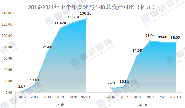 2016-2021年上半年虎牙与斗鱼总资产对比(亿元)