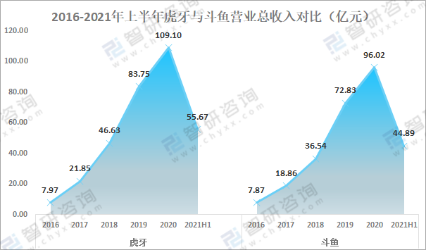 2016-2021年上半年虎牙与斗鱼营业总收入对比(亿元)