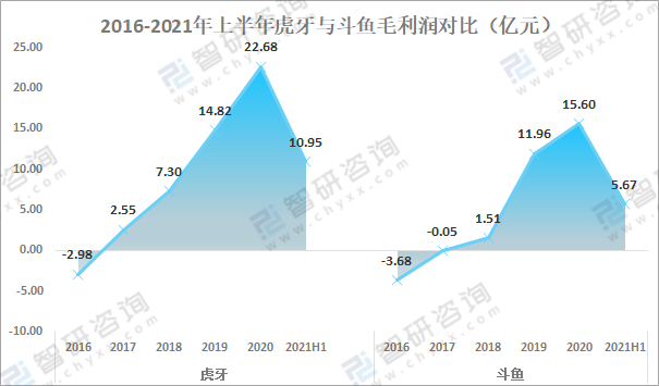 随着营业收入的增加,毛利润也随之增长,2020年虎牙毛利润达22.68亿元,较2019年增加了7.86亿元,2021年上半年虎牙毛利润为10.95亿元。2020年斗鱼毛利润达15.60亿元,较2019年增加了3.64亿元,2021年上半年斗鱼毛利润为5.67亿元。
