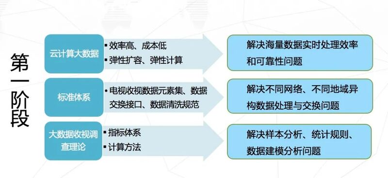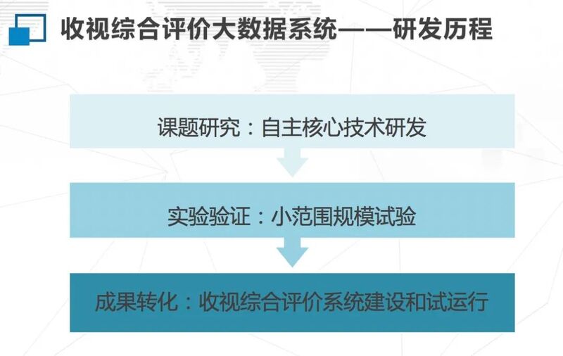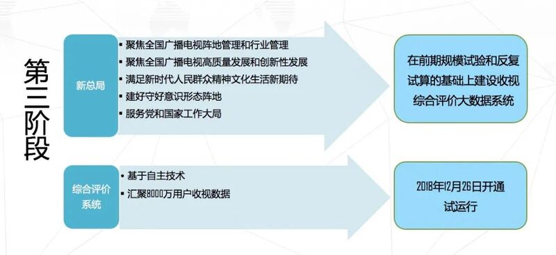 第三阶段,2018年下半年,国家广电总局决定在前期规模试验和反复试算的基础上,由广播电视规划院开展“广播电视节目收视综合评价大数据系统”建设工作。