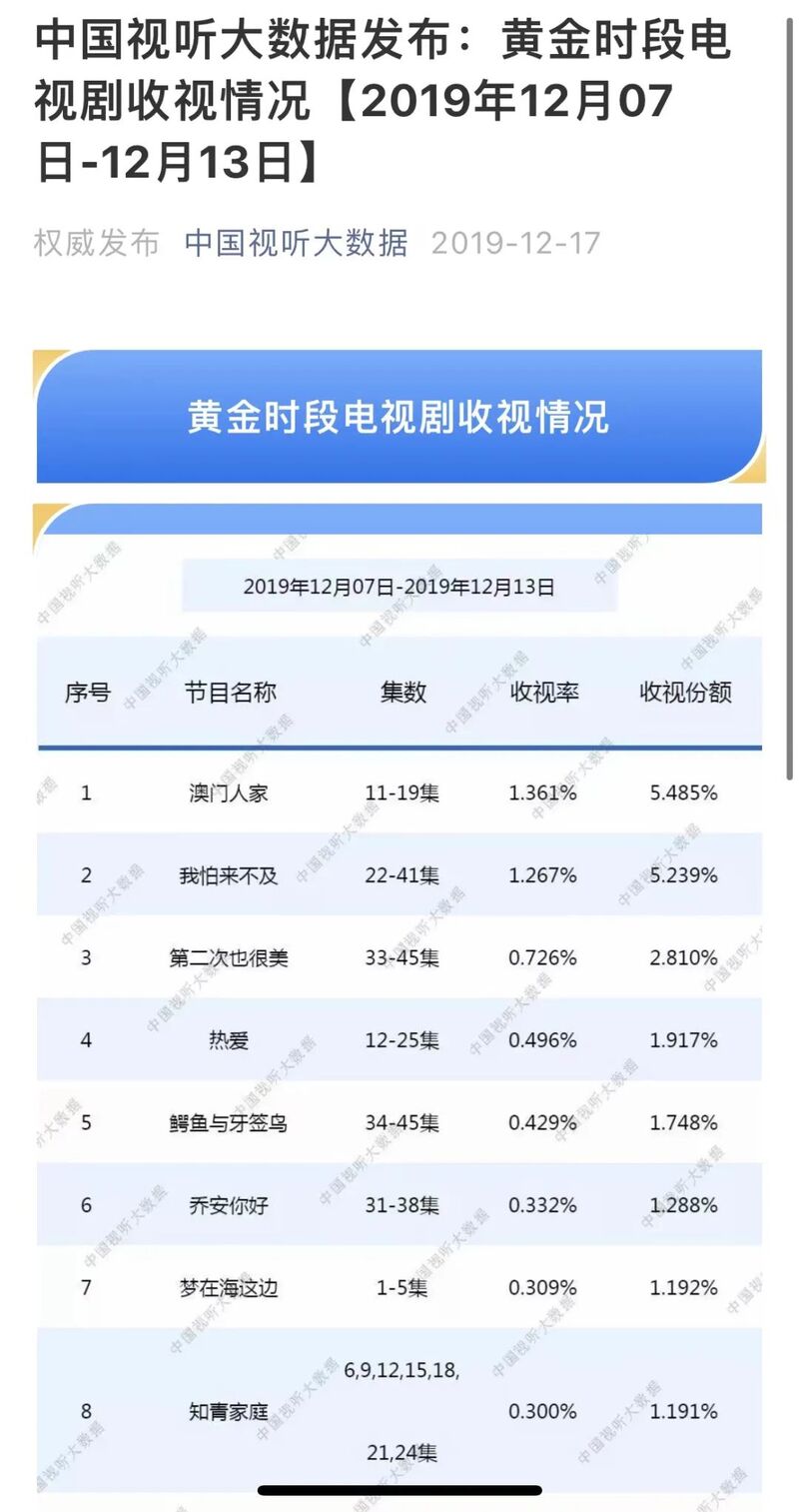 “中国视听大数据(CVB)”向社会公布的第一份收视数据。