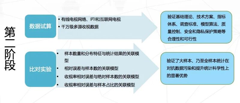 第二阶段,广播电视规划院组织多家有线电视网络、IPTV和互联网电视机构,开展了千万级规模的技术实验,验证了第一阶段形成的大样本收视调查的基础理论、技术方案、指标体系、调查标准、模型算法以及质量控制、安全与隐私保护策略等的合理性和可行性。